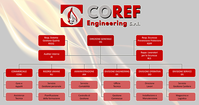 COREF Engineering è strutturata secondo un organigramma funzionale al carattere dinamico e operativo, con il quale gestisce autonomamente ogni fase di pianificazione dei lavori mantenendo una stretta collaborazione interna a ogni livello del proprio organico.