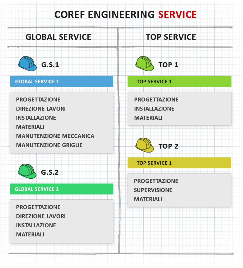Il livello di servizio varia dalla progettazione alla manutenzione, dalla direzione dei lavori all'installazione e fornitura
